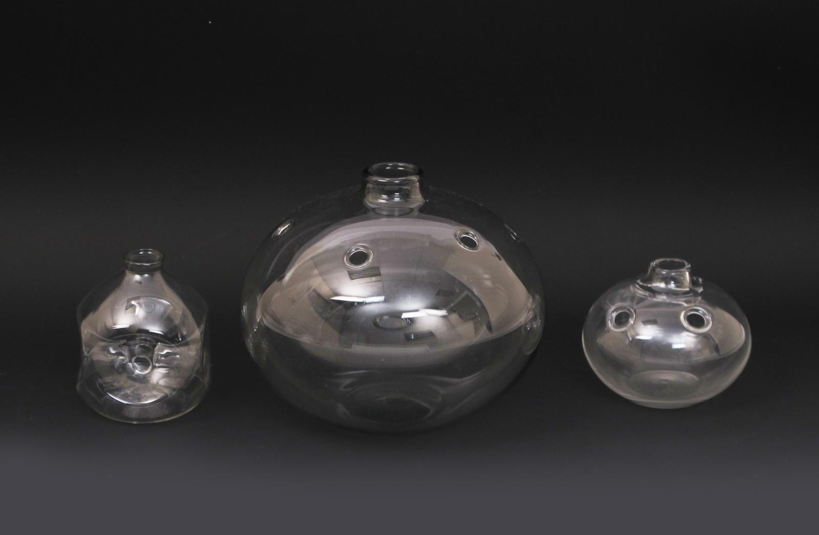 A Holmegaard clear glass Flower Frog vase by Michael Bang, ovoid form with pulled solifleur neck, the shoulder with six flower stem aperture, another smaller with four aperture to the shoulder and another clear glass vase etched Holmegaard and MB monogram 14.5cm. high (3)