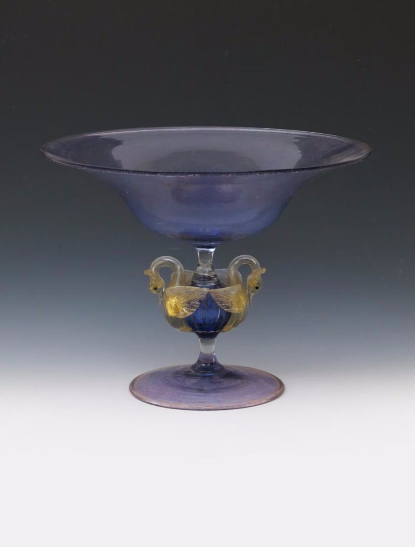 A large amethyst glass tazza in the manner of Salviati, the knopped stem with applied clear glass swans, with aventurine decoration and applied glass eyes, on flaring slightly domed base unsigned