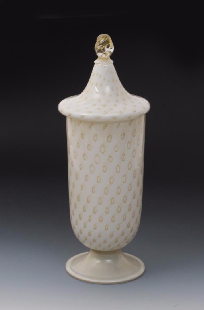 A Murano glass urn and cover, white glass with aventurine decoration, cased in clear, the cover with twisted glass finial, a red and green striped glass plate, a large striped glass bowl, a vase by Barry Cullen and two etched glass vases, 35cm. high (6)