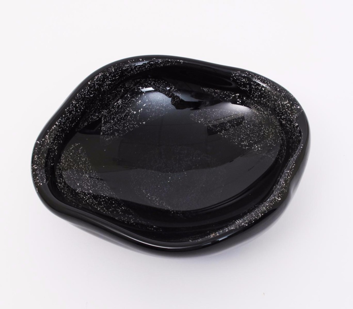 An Archimede Seguso glass dish, the irregular form thick black glass internally decorated with silver, cased in clear etched Archimede Seguso Murano to base 27cm. wide