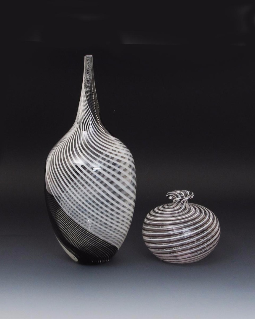 A tall glass solifleur vase in the manner of Dino Martens, aubergine and white stripes cased in clear, an ovoid vase with aubergine and white stripes and four other glass items unsigned 35cm. high (6)