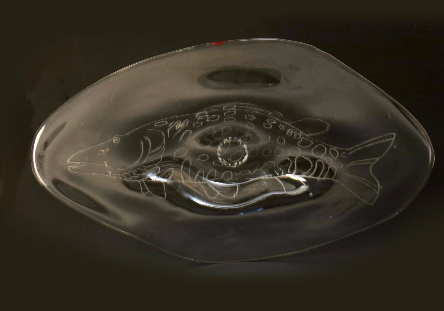 A large etched glass platter possibly by Inkeri Toikka, etched to the well with a large fish, a large, thick circular glass bowl with polished rim, a clear and black glass lazy susan and a large welled green glass bowl unsigned 50.5cm. wide (4)