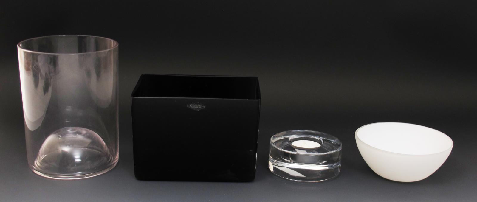 An Orrefors Puck glass candlestick designed by Lena Bergstrom, thick clear glass, in original box, four iittala votive glass candle holders designed by Harri Koskinen in original boxes and a collection of glass etched mark, 10cm. diam.