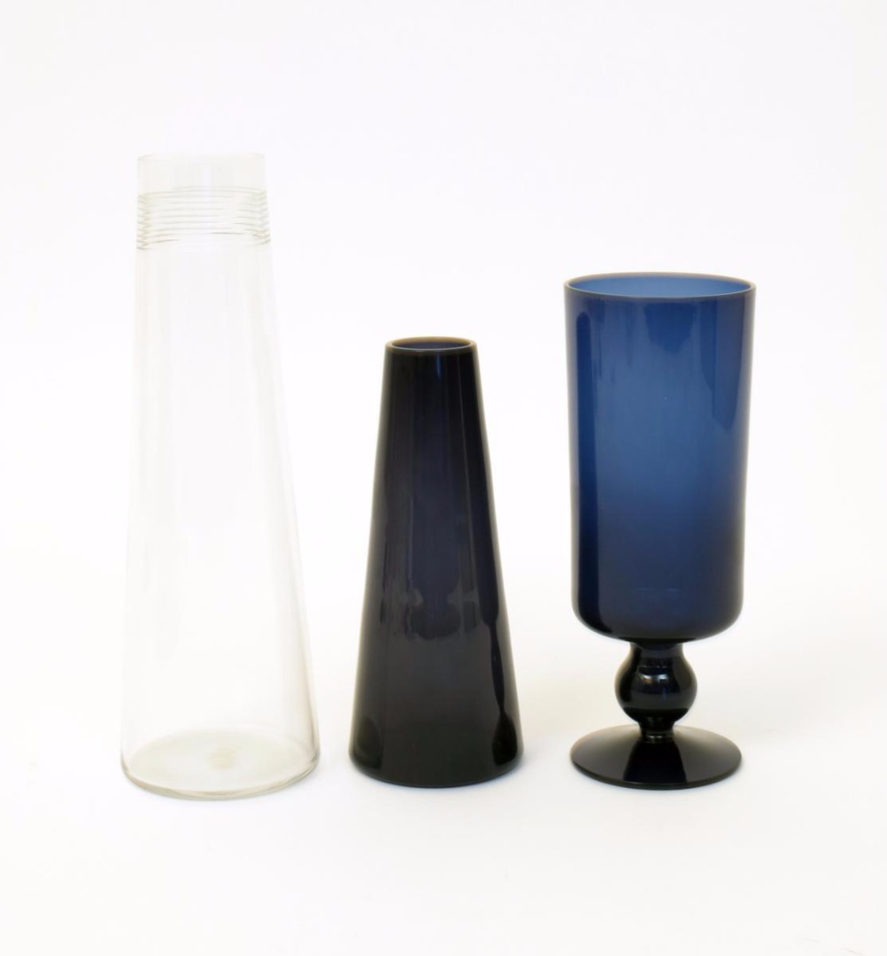 An early Nuutajarvi blue glass footed vase designed by Oiva Toikka, shape no.3407, produced between 1958 and 1966, a Nuutajarvi clear glass decanter designed by Kaj Franck and a clear glass vase with engraved bands designed by Saara Hopea and a collection of glass 19.5cm. high
