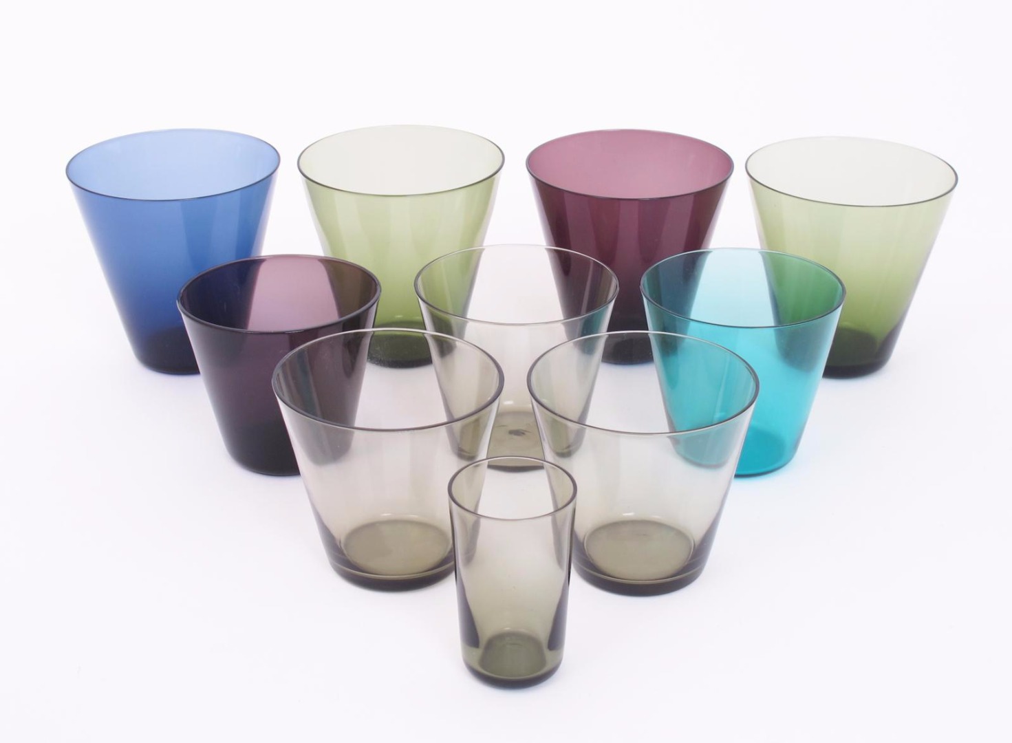 A collection of Nuutajarvi glass designed by Kaj Franck, including eleven various coloured glass tumblers, 8cm. high (tallest)