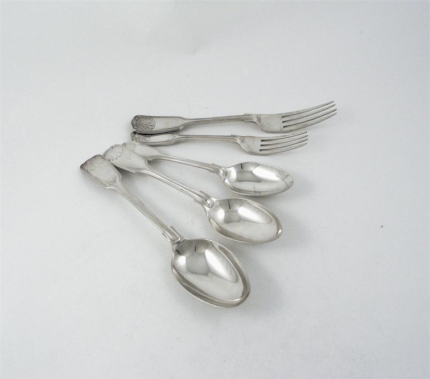 A late Victorian part canteen, of fiddle thread and shell flatware comprising: four large tablespoons, six smaller tablespoons, nine tableforks, six dessert forks, and six dessert spoons by Walker & Hall, Sheffield 1899/1900, 88oz. (31)