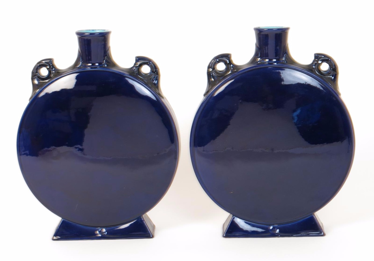 A pair of Minton's Art Pottery moonflask, the flattened disc body with applied modelled foliate handles, on flaring rectangular base, covered in a deep blue glaze impressed marks to base, fine hairline to top rim of one, 34.5cm. high (2)