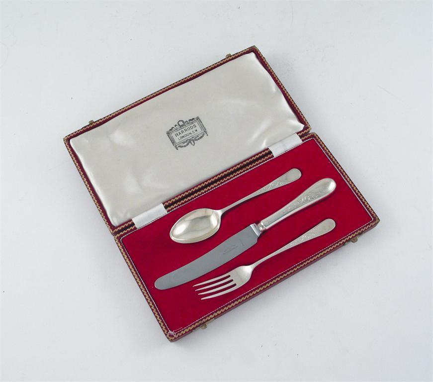 A modern engraved christening fork, spoon and knife, in a fitted case, retailed by Harrods, Sheffield 1960, 1.3oz weighable silver.