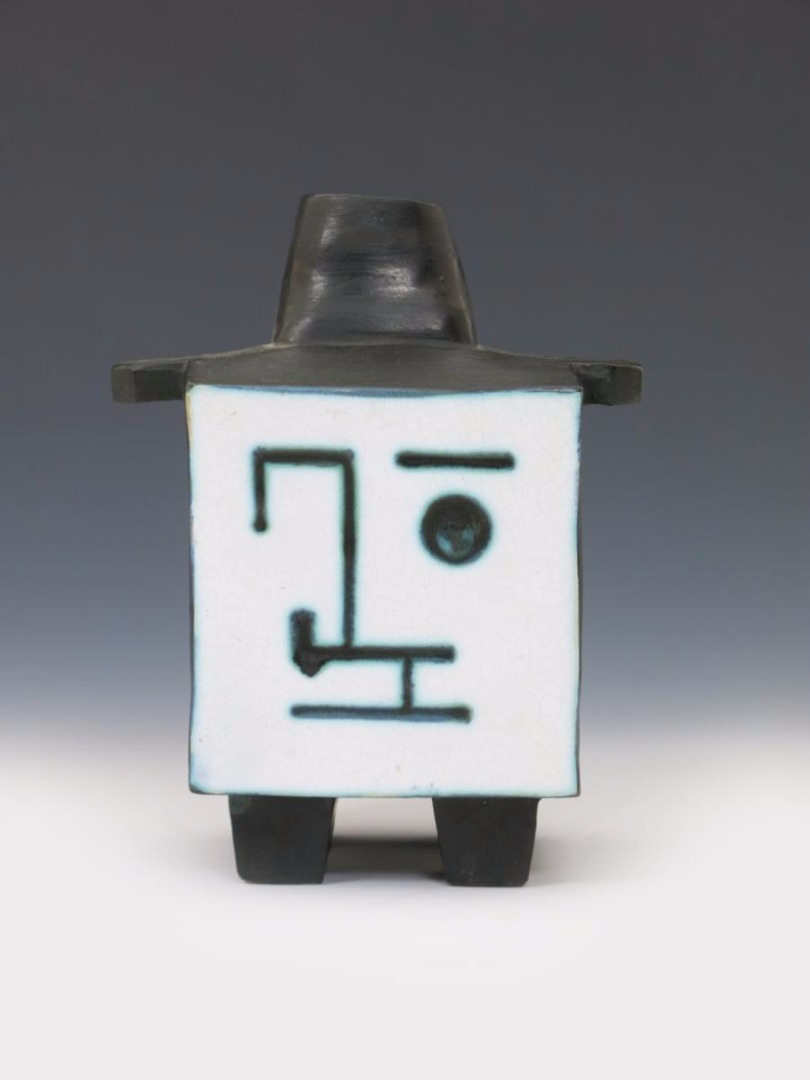 A rare and early Troika Pottery Lidded Cube vase by Leslie Illsley, square section, painted with a smiling cubist face, the reverse with a sad, crying face, in blue/black on a white ground, the feet, shoulders and handles glazed bronze impressed Troika trident motif 15cm. high