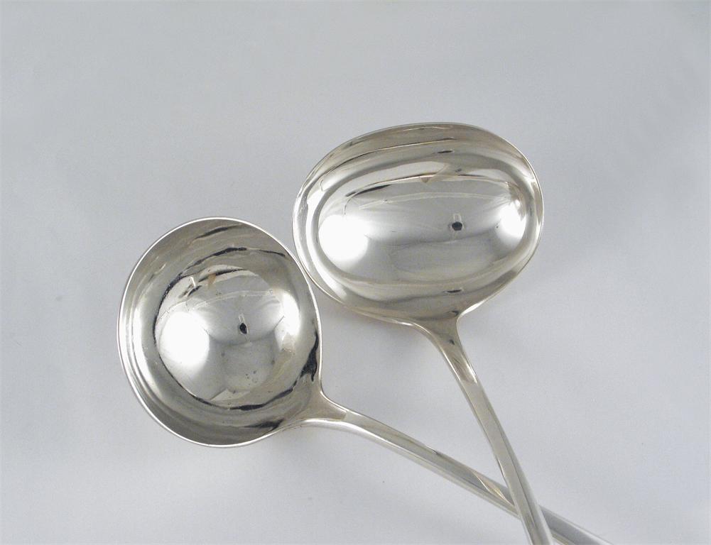 A large modern soup ladle, with single drop, by Wakely & Wheeler, London 1915, 12.5in (31.7cm) long, 8oz, together with a modern soup ladle with oval bowl, by James Deakin & Son, Sheffield 1910, 12in (30.5cm) long, 6.2oz.