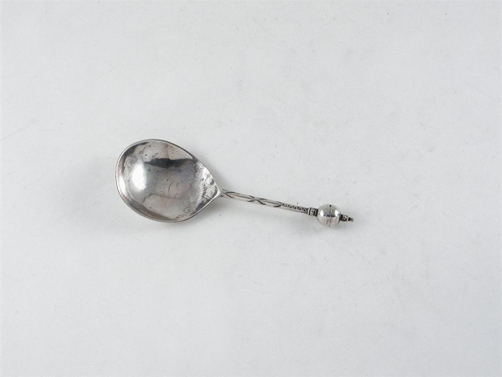 A 17th century Norwegian spoon, with a ball knop, and a partly-engraved bowl maker's mark only struck twice, (worn), possibly by Jochim/Jochum Haveman, Christiania, mid 17th century, 5.5in (14cm), 0.75oz.