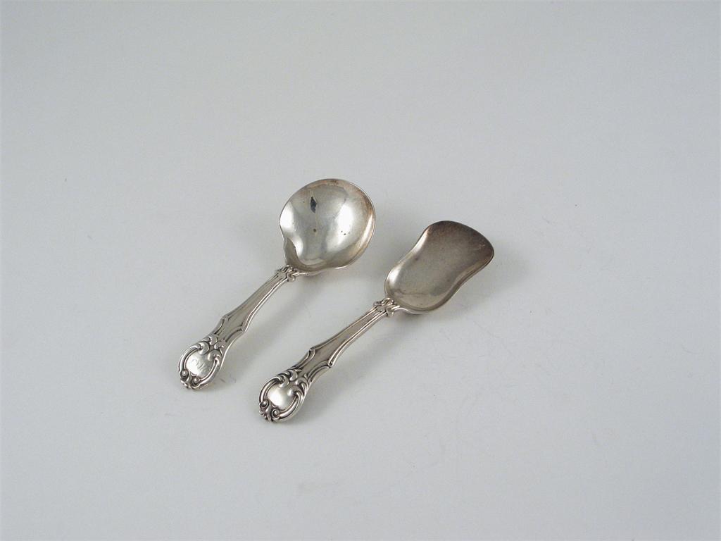 Two Victorian pattern caddy spoons: one with a 'scoop' bowl London 1836; the other with a kidney shaped bowl, initialled, London 1837 (both by S. Hayne & D. Cater). (2)