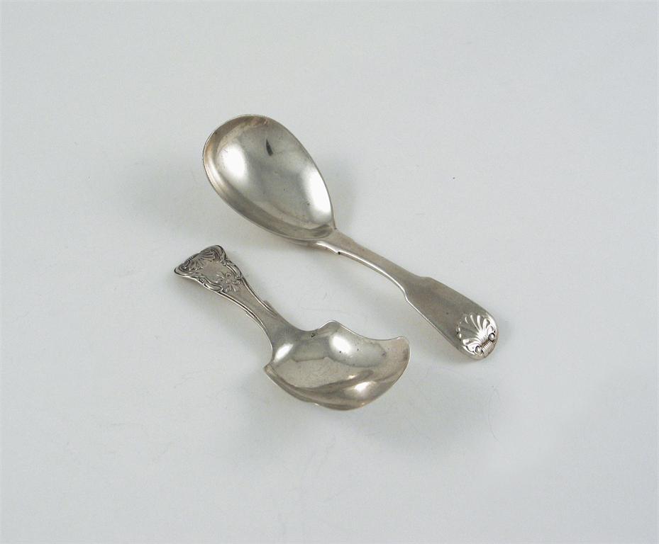 A Victorian Hourglass pattern caddy scoop, by George Unite, Birmingham 1838 and a fiddle and shell example, by William Bateman, London 1821. (2)