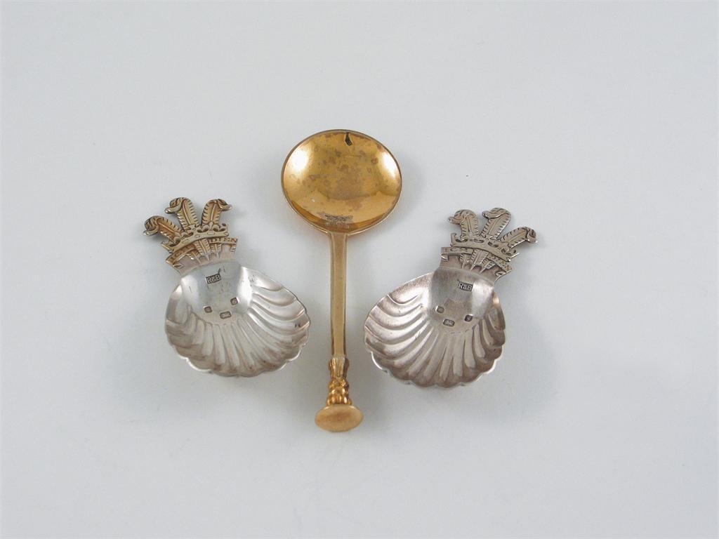 Two modern commemorative caddy spoons, with the Prince of Wales's feathers terminal, by Roberts & Belk, Sheffield 1981 and a Victorian silvergilt sealtop caddy spoon, crested, by George Adams, London 1867. (3)