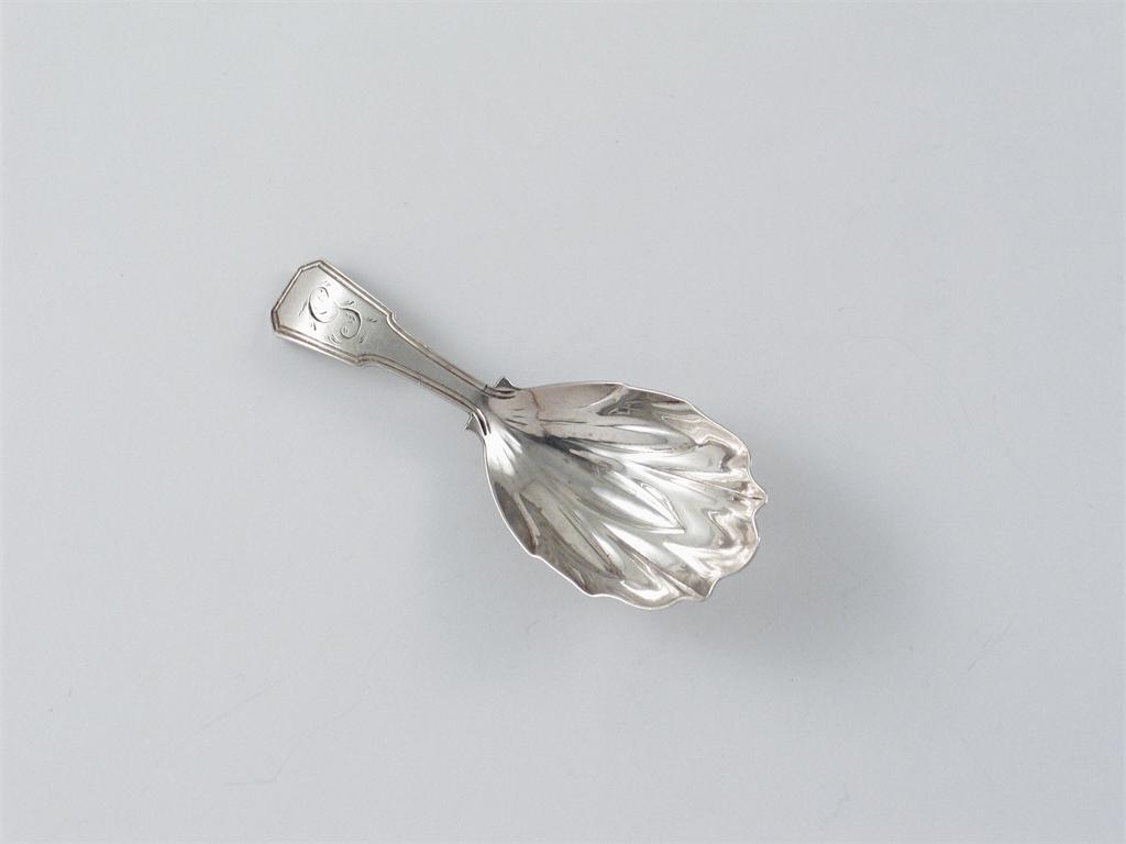 A George III caddy spoon, with fluted bowl and reeded fiddle and thread pattern stem, initialled 'G', by Josiah Snatt, London 1808.