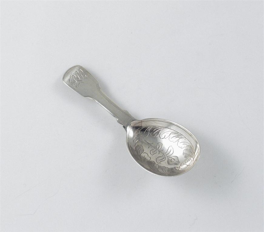 A George IV caddy spoon, with engraved foliage in the bowl, fiddle pattern stem with pricked border, initialled, by John Blades, London 1825.