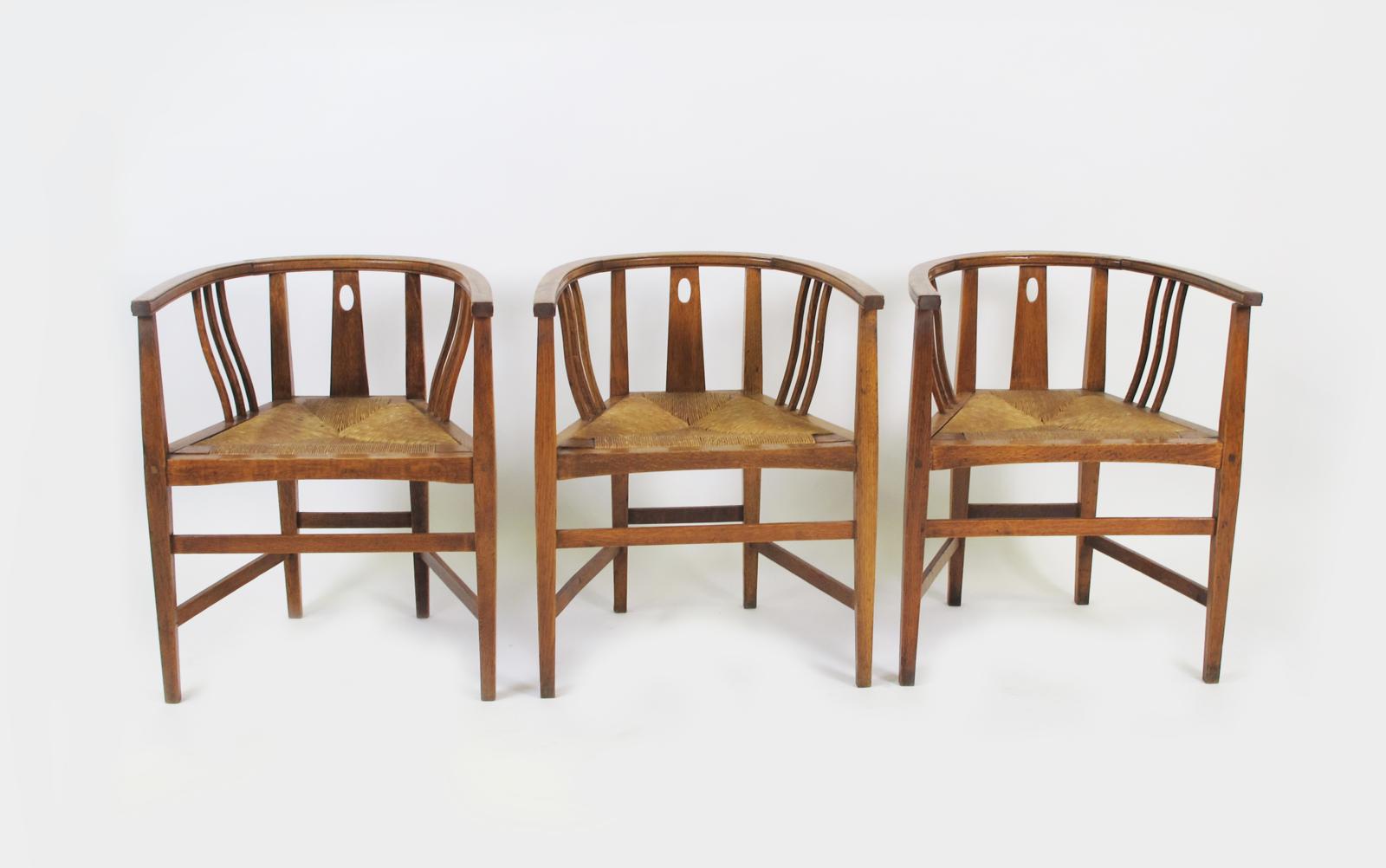 A set of three Wylie & Lochhead oak tub chairs designed by Ernest Archibald Taylor