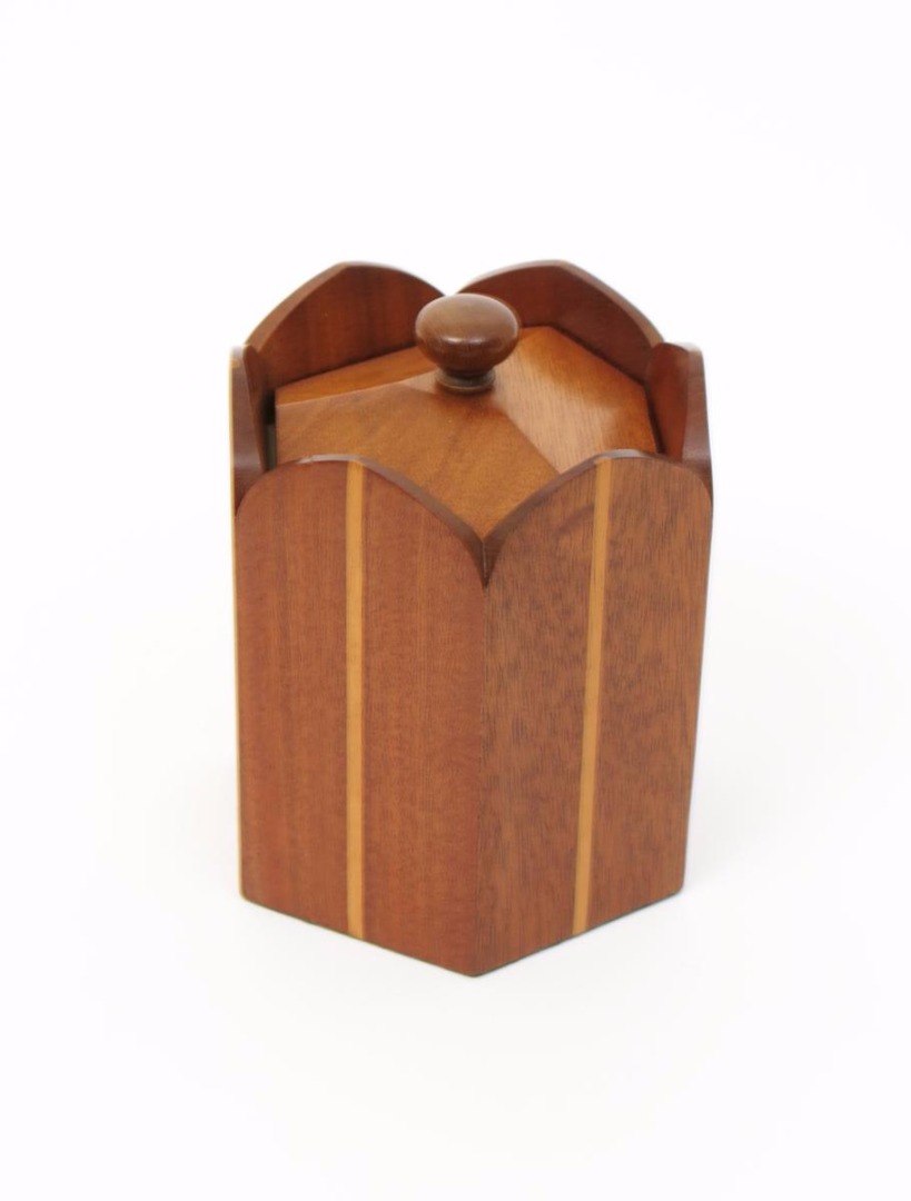 A Cotswold School walnut caddy and cover the design attributed to Hugh Birkett, hexagonal section the caddy formed as a rounded crown, cedar lined unsigned 13.5cm. high