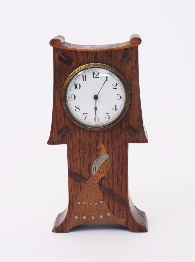 An Arts and Crafts inlaid oak mantel clock, the shaped wooden body with scroll mantel, inlaid with a peacock in wood and pewter, the circular enamel dial flanked with Art Nouveau flower stems, unsigned, losses to foot rim 29cm. high