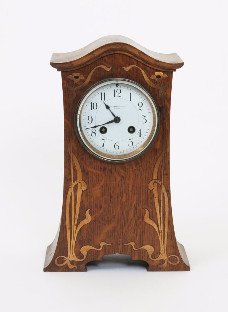 An Arts and Crafts inlaid oak mantel clock