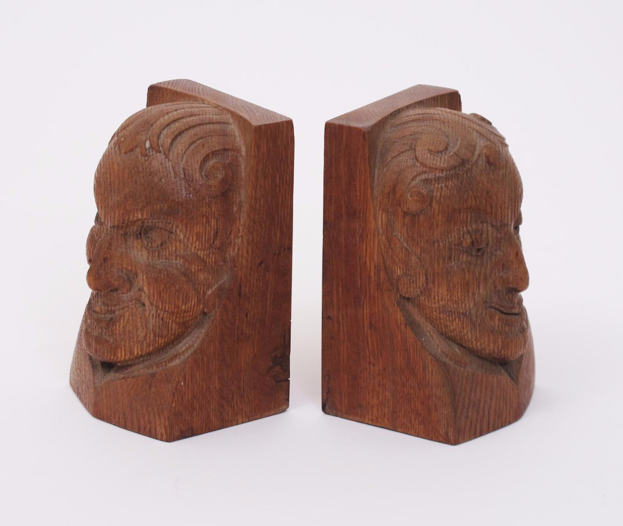 A pair of Arts and Crafts oak book ends, each carved with a bust of a woman unsigned 14cm. high