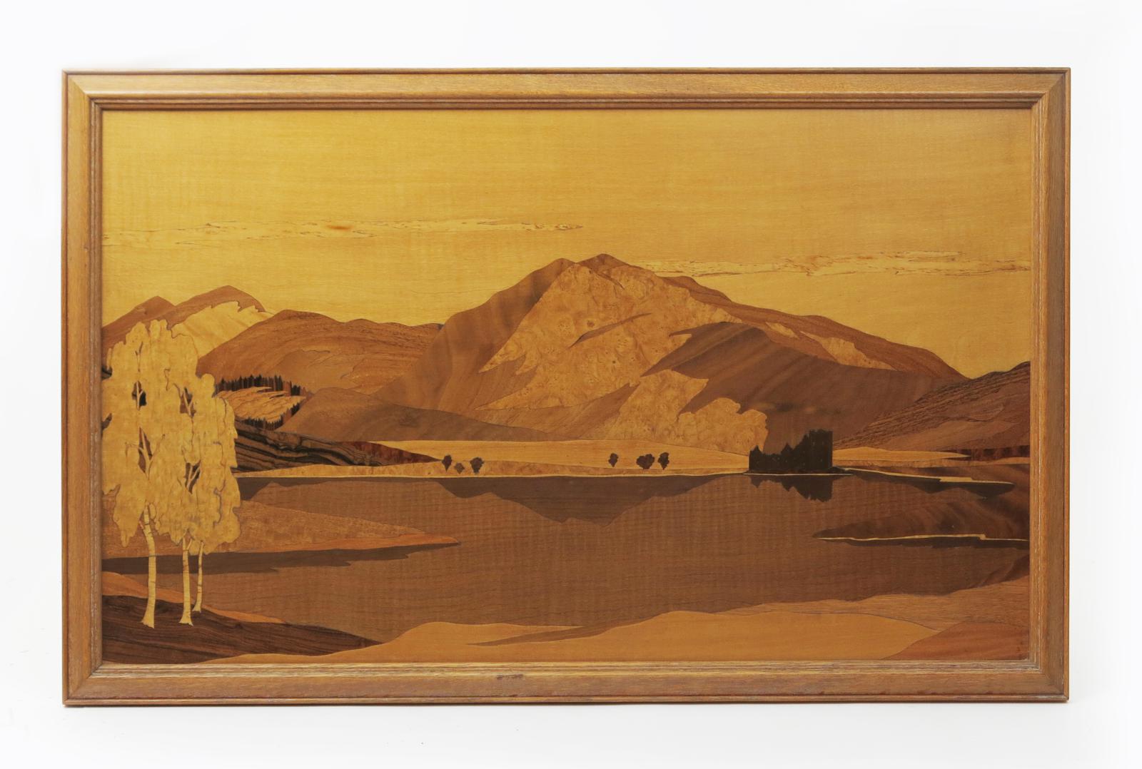 The Hunter a Rowley Gallery marquetry wall mirror, the square panel depicting a hunter walking in a stylised landscape, and a large marquetry panel Killchurn Castle probably by the Rowley Gallery, applied label, mirror 52.5 x 20.5cm. (2)