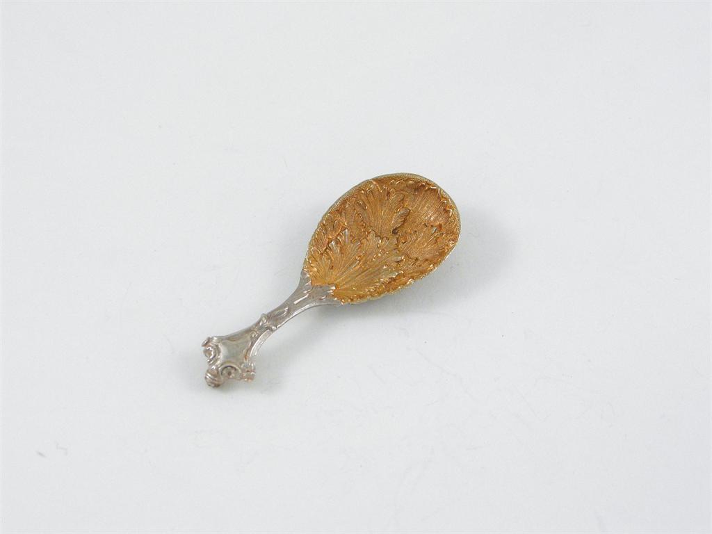 A Victorian cast caddy spoon, with foliate decoration, a gilt bowl and a shaped stem with a vacant cartouche, by George Adams, London 1851.