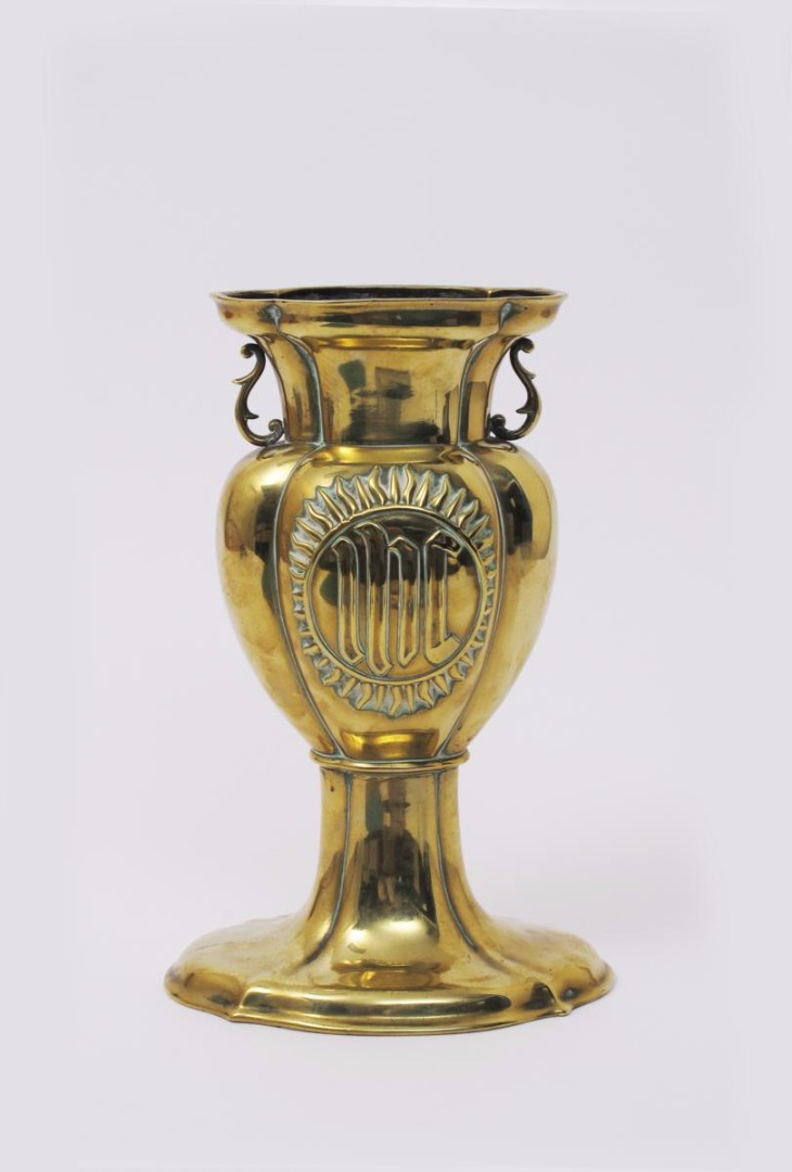 A Gothic Revival cast brass vase, the swollen, ribbed body cast with a sun motif, unmarked 29cm. high