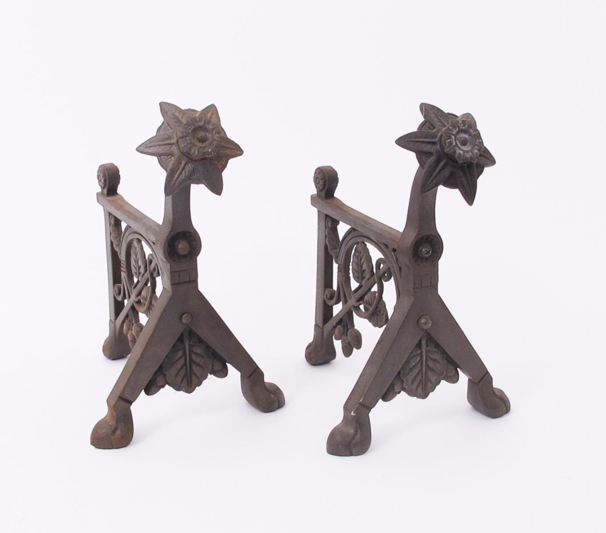 A pair of Aesthetic Movement cast iron fire dogs, in the manner of Dr Christopher Dresser, model no. 879, cast with scrolling foliate panels and stylised flowerhead terminal, stamped model no and registration diamond for 1876 28.5cm. high