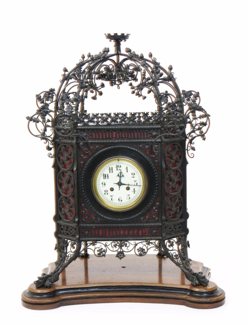 A patinated metal clock in the manner of Cyril Colnik, dated 1897, the pierced metal framework with panels of lion rampant, the circular dial flanked with Anno Domini MDIIILXXXXVI, with domed scrolling foliate wirework canopy and domed cupola, and flaring grotesque dragon feet unsigned 65cm. high