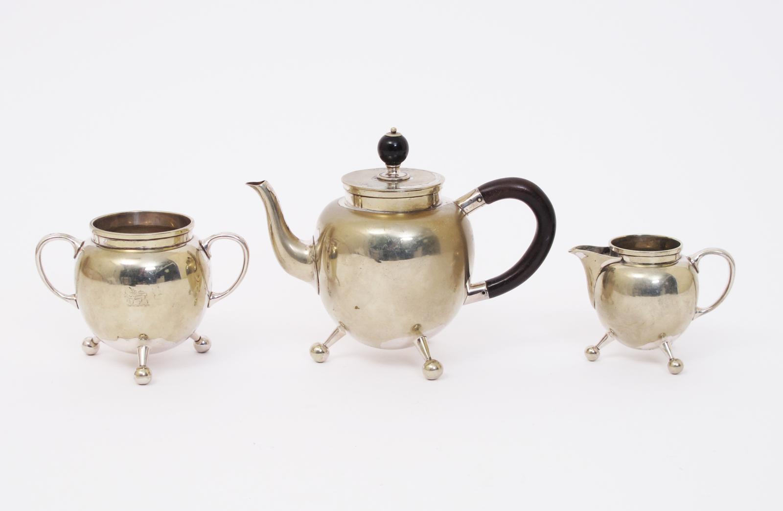 A Hukin & Heath electroplated three piece tea set in the manner of Dr Christopher Dresser, model no.2077, the ovoid body with tripod ball feet, ebonised wood handle and finial to the tea pot, each piece incised with a unicorn crest stamped marks, 12cm. high (3)