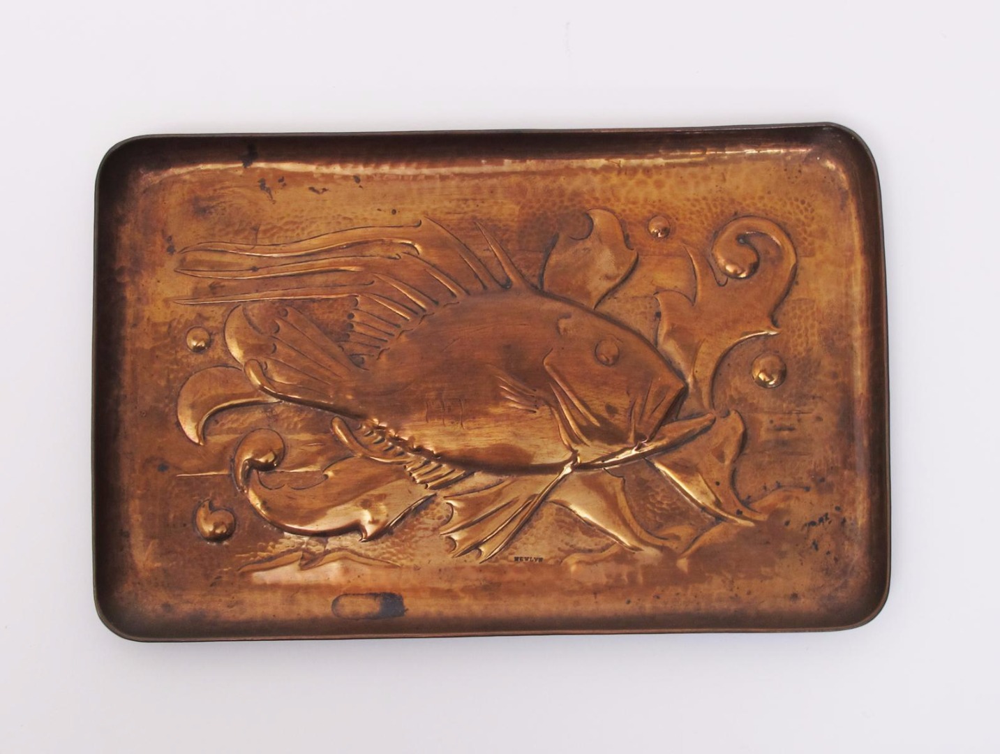 A Newlyn Industrial Class repousse hammered copper string-holder, cylindrical for with shallow domed cover, hammered in relief with a frieze of fish and waterweed, a Newlyn copper Tobacco jar and cover, a Newlyn small box and cover and a Newlyn tray stamped Newlyn marks, string-holder 10cm. high. (4)
