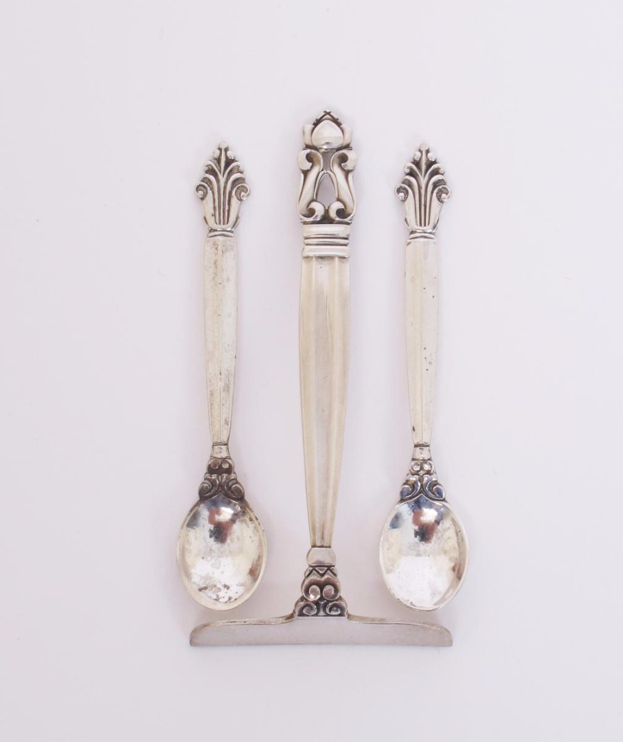 A Georg Jensen Acorn pattern silver baby's push and two small Georg Jensen spoons