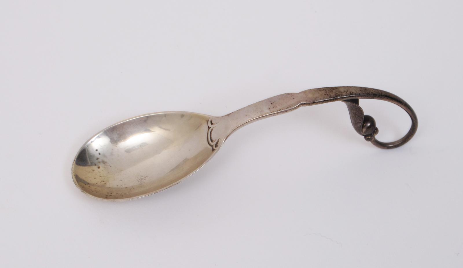 A Georg Jensen Blossom silver spoon, model no.24, hammered finish, stamped marks, 12.5cm. long