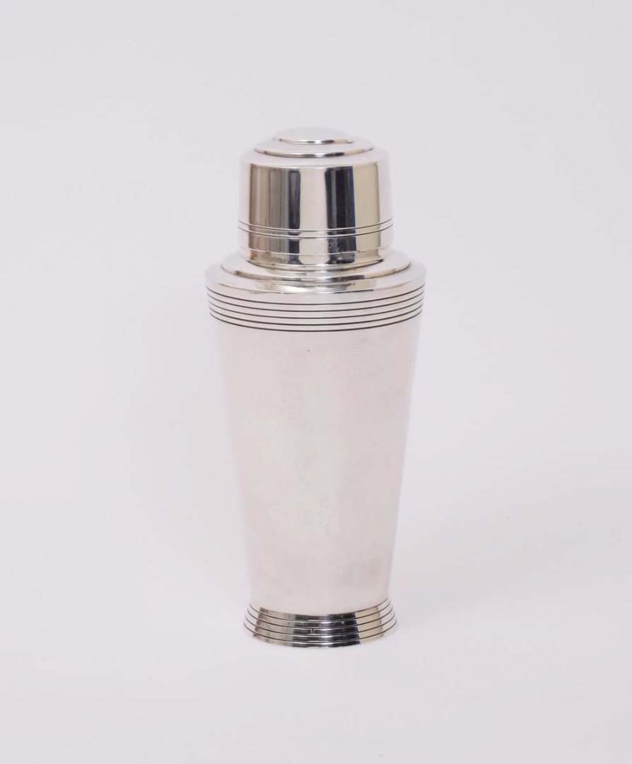 A Mappin & Webb electroplated metal cocktail shaker designed by Keith Murray