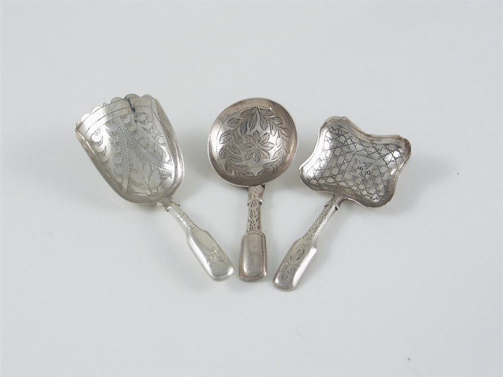 Three caddy spoons, with hollow fiddle stems and engraved bowls, one with a fan-shaped bowl, initialled, by Joseph Taylor, Birmingham 1819 another with a waisted oblong bowl initialled "O", by Lawrence & Co, Birmingham 1833 and another with a circular bowl by Unite & Hilliard, Birmingham 1831. (3)
