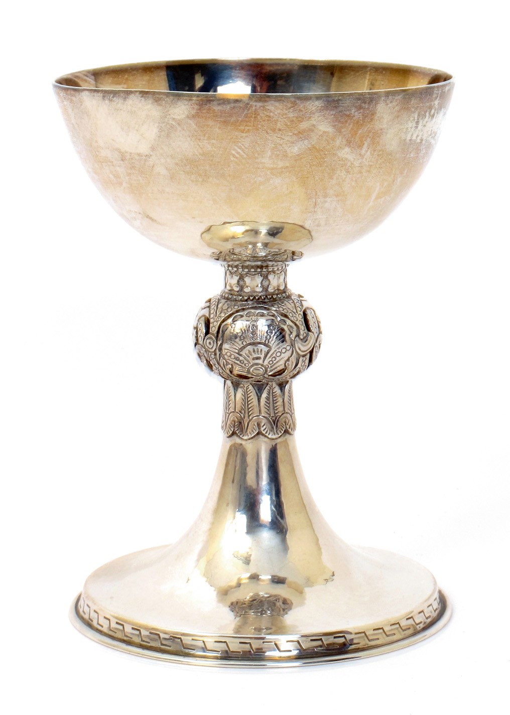 A silver chalice possible designed by R.E.Stone, the tapering foot supporting pierced knop and flaring bowl, the knop with chased Egyptian fan flower and foliage panels, the foot a frieze of Z motif stamped marks JF London 1918, 15cm. high