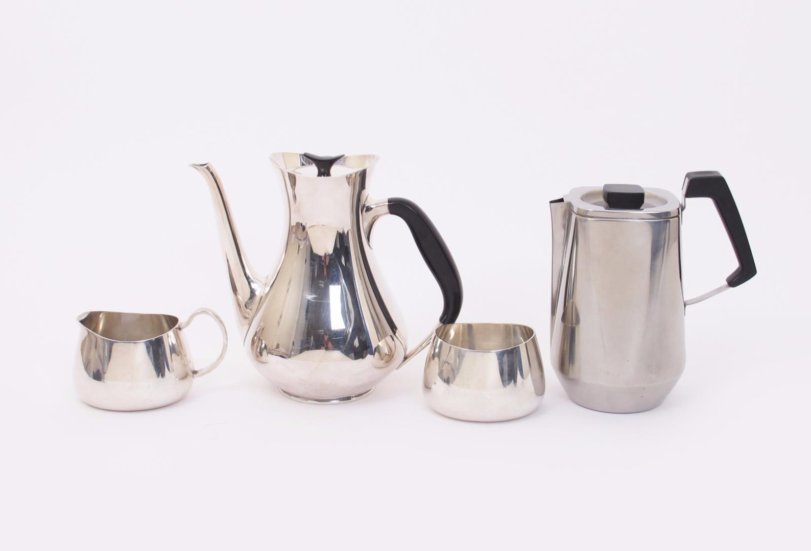 A Cohr electroplated metal coffee pot and cover, with ebony handle and finial, a Walker & Hall stainless steel sugar basin and milk-jug designed by David Mellor and a stainless steel hot-water pot and cover stamped marks, 20cm. high (4)