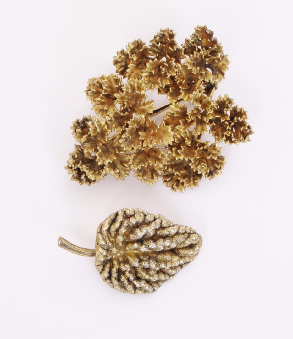 A Flora Danica silver gilt brooch by Eggert Denmark, by Orla and Grethe Eggert, modelled as a leaf, and another larger stamped marks, largest 6cm. wide