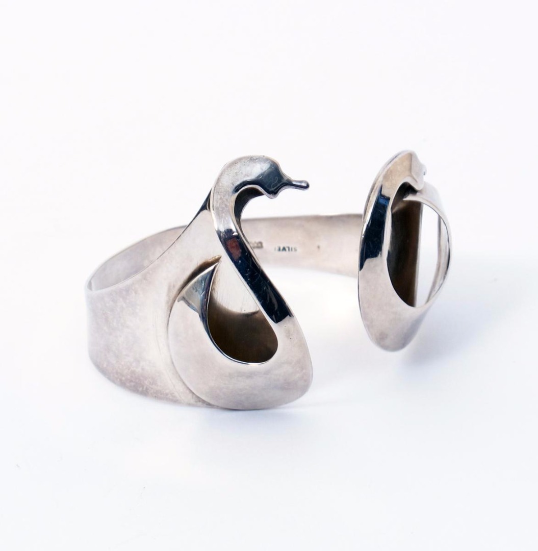 A Lapponia silver bangle, the graduated curved band applied with a pair of courting swans, with original silver fabric drawstring pouch stamped marks, 6.5cn wide.