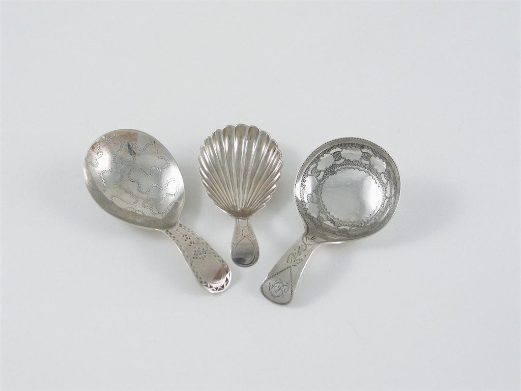 Three George III caddy spoons, with engraved decoration (one with a fluted bowl), mixed maker's and dates 1796-1811. (3)