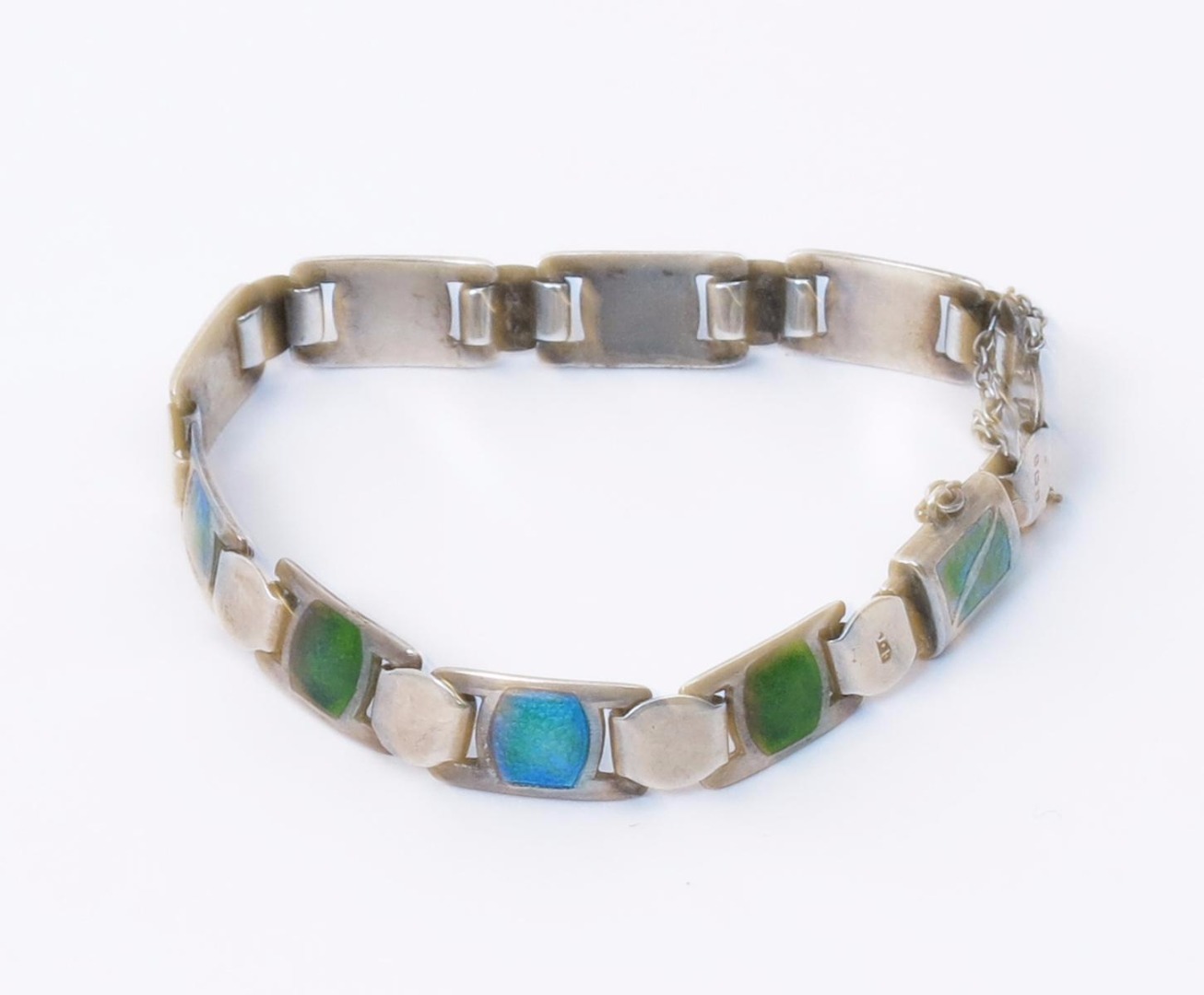 A James Fenton silver and enamel link bracelet, the swollen rectangular links alternately enamelled green and blue stamped marks, Birmingham 1908 18cm. diam (approx).