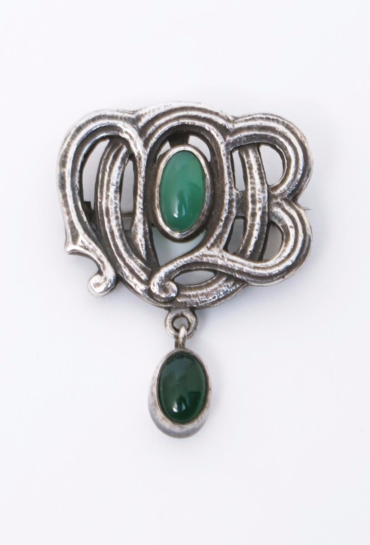 An unusual silver pendant probably Murrle Bennett, the frame cast and pierced to form MB monogram for Murrle Bennett, set with two green chrysoprase stones unmarked, 4.5cm. long