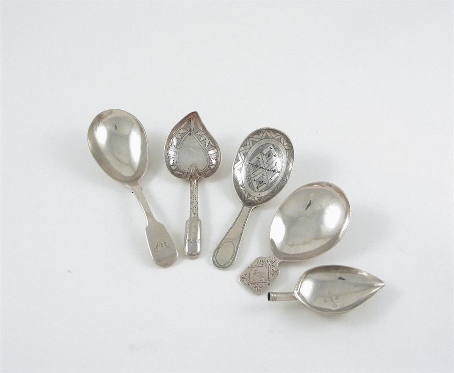 Five caddy spoons: a Victorian fiddle example, a George III example with bright-cut lug handle, a George III example with "pricked" work, an engraved example with hollow fiddle stem, and a George III bowl only. (5)