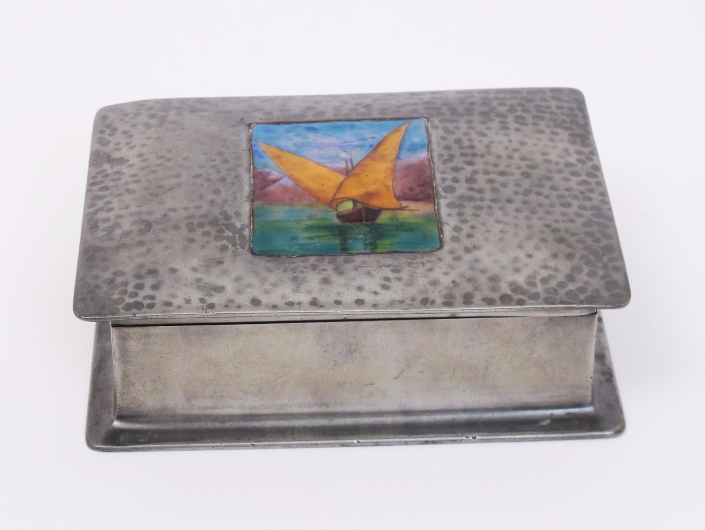 A Liberty & Co pewter box with enamel panel by Charles Fleetwood Varley, the hinged cover, with hammered finish, set with enamel panel of a fishing boat at full sail, cedar lined, stamped 083 16.5cm. wide
