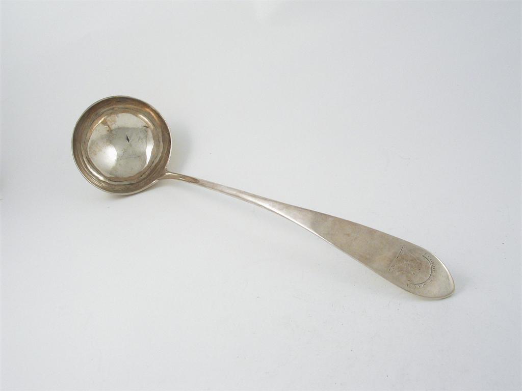 A George III Scottish soup ladle, with a "Celtic point", engraved crest and motto "CORDE ET MANU", by F. Howden, Edinburgh 1798, 6oz.