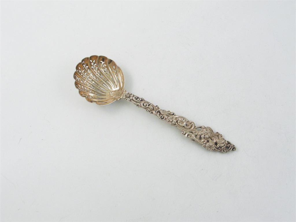 A Victorian sugar sifter spoon, with a cast and matt stem of openwork floral scrolls, by J. Wakeley & F.C. Wheeler, London 1889, 1.5oz.