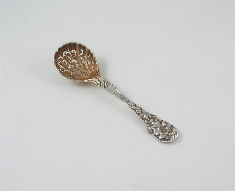 An early Victorian cast sugar sifter spoon, with a matted, foliate and floral stem, matted gilt bowl pieced with scrolls, by John Evans (II), London 1843, 6.7in (17cm) long, 2oz.