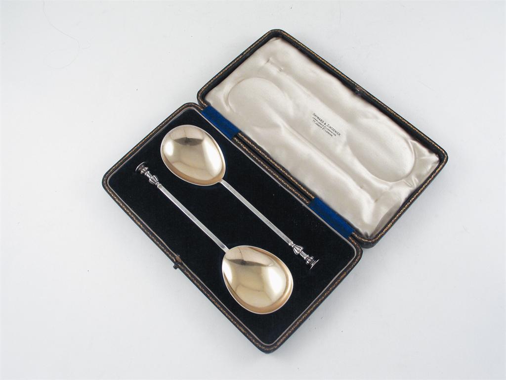 An Edwardian cased pair of seal top spoons, with gilt bowls, by Messrs Hutton & Son, London 1909.