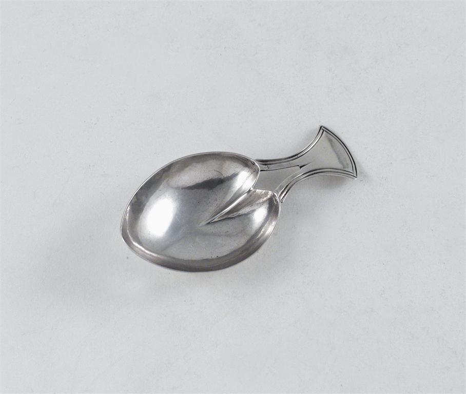 A George III caddy spoon, with a bifurcated axe shaped stem, and reeded border, with a deep heart-shaped bowl, by Joseph Wilmore, Birmingham 1808.